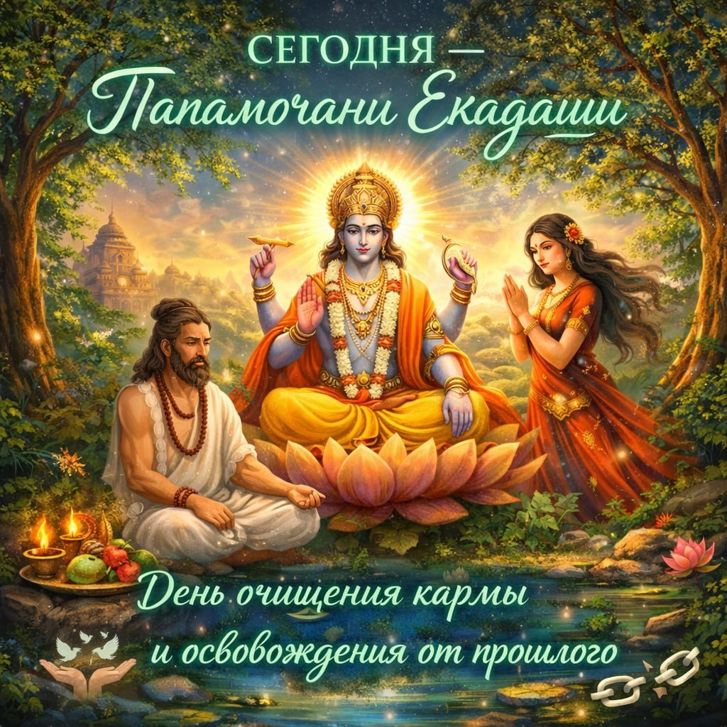 ✨ 📅 Мои дорогие, 15 марта — священный день Папамочани Экадаши 🌙 — один из особенно очищающих дней ведического календаря. Название «Папамочани» переводится как «освобождающий от грехов и ошибок прошлого». Этот Экадаши считается временем глубокого очищения кармы, освобождения от внутренних тяжестей и восстановления духовной чистоты. Поэтому Папамочани Экадаши особенно благоприятен для тех, кто хочет отпустить прошлые ошибки, освободиться от тяжёлых кармических последствий и начать новый этап жизни с чистым сердцем и ясным намерением 🌿 🪷 15 марта, воскресенье — Папамочани Экадаши Начало поста: 15 марта, 06:40 Паран (выход из поста) для Москвы: 16 марта, 06:35 – 09:10 🌿 Соблюдение поста в Папамочани Экадаши даёт: • 🌱 Очищение кармы и освобождение от накопленных негативных последствий прошлых поступков • ✨ Освобождение от чувства вины, тяжёлых воспоминаний и внутренних блоков • 🕉 Благословение Господа Вишну на духовное обновление и гармонию судьбы • 💚 Исцеление эмоционального с