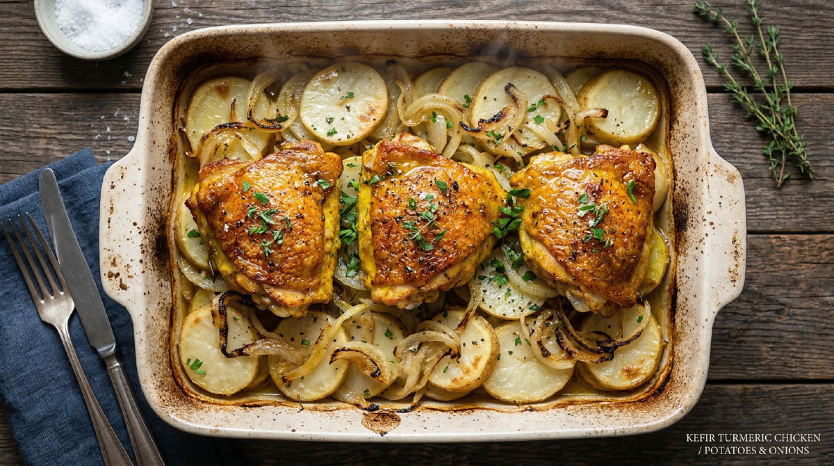Что происходит: мясо при запекании выделяет сок, он пропитан специями из маринада, и весь этот ароматный сок стекает вниз, на картошку и лук. Картошка впитывает его как губка, и на выходе вы получаете не просто печёный картофель, а картофель со вкусом курицы, куркумы и кефирного маринада. Лук при этом карамелизируется, становится сладковатым, почти тает во рту. Это полноценное блюдо — и мясо, и гарнир готовятся одновременно, в одной форме, и результат получается гораздо интереснее, чем если бы всё готовилось по отдельности.