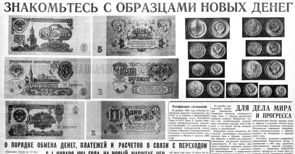 Всё началось с постановления Совета Министров СССР № 470 от 4 мая 1960 года. Оно называлось «Об изменении масштаба цен и замене ныне обращающихся денег новыми деньгами». Официальная цель — упростить расчёты, облегчить бухгалтерию и «придать большую полноценность рублю».