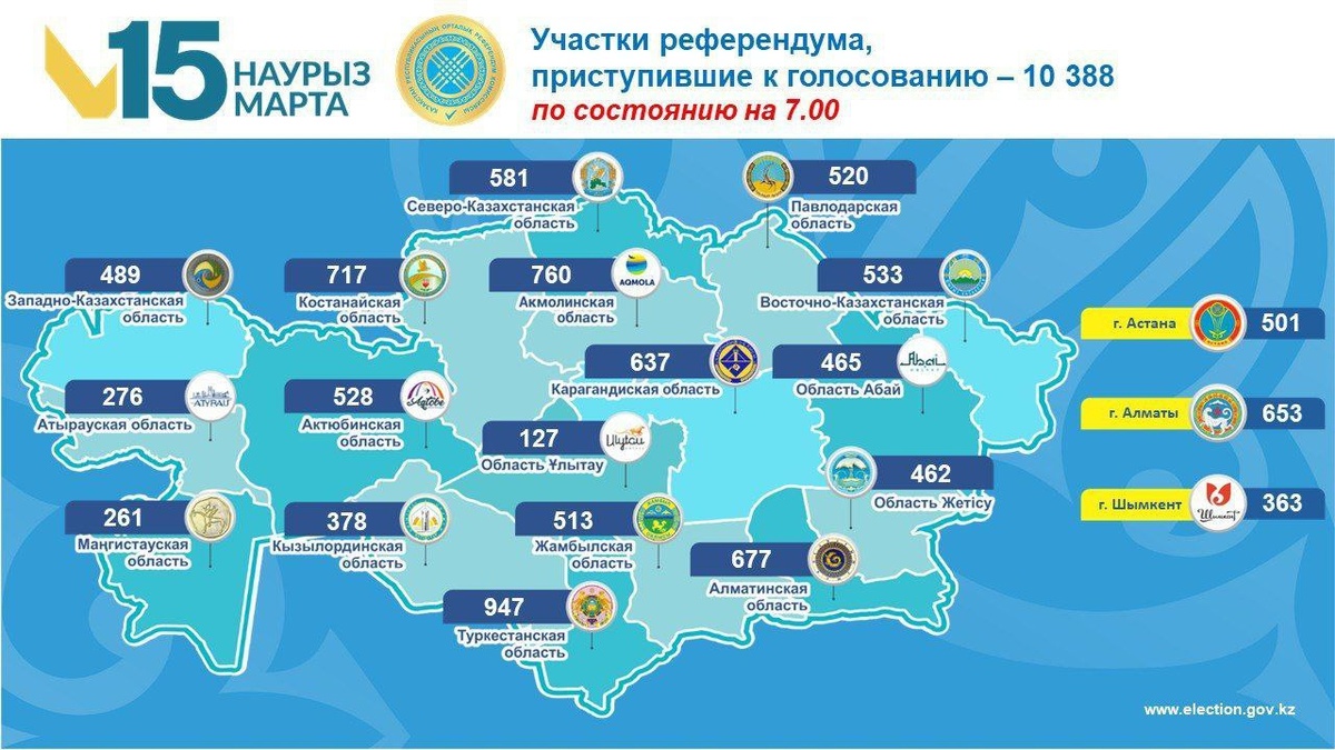 ? Как отметили в ЦИК РК в стране работают 10 388 участков. «В списки включено 12 461 796 граждан. Кроме того участковые комиссии по письменным заявлениям граждан выдали 17 514 открепительных удостоверений на право голосования», – пояснили в ЦИК. Казахстанцы, которые находятся в других государствах, могут проголосовать на 71 участке в 54 странах. Однако в этот раз число мест для голосования за рубежом сократили из-за ситуации на Ближнем Востоке. В списке – Иран, Израиль, Иордания, Катар, ОАЭ, Оман, Ливан, Кувейт, Украина и Эфиопия. Такое решение приняли в связи со сложной военно-политической обстановкой и низким уровнем представленности наших граждан. Общее количество голосующих граждан РК за рубежом составило 14 380 человек. Следить за ходом референдума вы можете на сайте CMN.KZ – здесь идёт прямая трансляция голосования. t.me/CMN_KZ