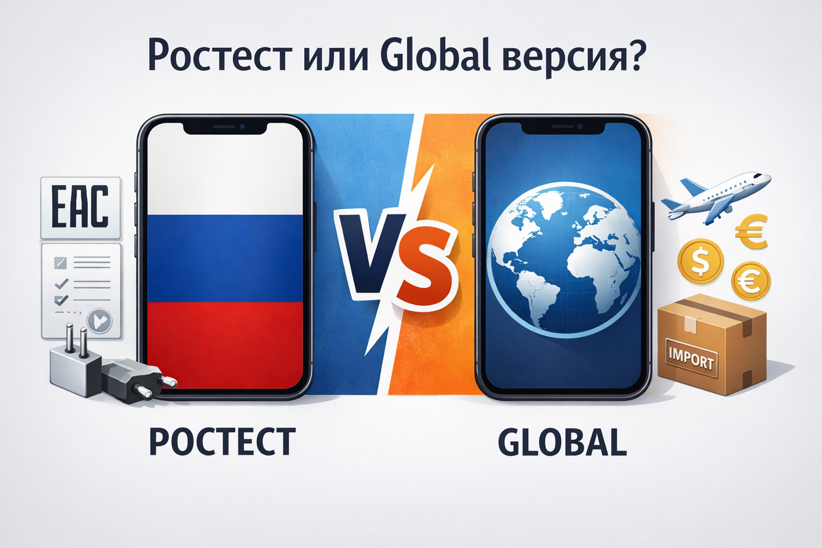 При покупке смартфона, особенно iPhone, в России часто возникает вопрос: какую версию выбрать — Ростест (РСТ) или Global. Продавцы нередко используют эти обозначения в описании товара, из-за чего у покупателей создаётся впечатление, что это разные устройства. На практике разница между ними обычно не связана с качеством или функциональностью, но есть нюансы, которые важно учитывать перед покупкой. Ростест — это устройство, которое официально ввезено на российский рынок и прошло обязательную сертификацию. Маркировка РСТ или EAC означает, что смартфон соответствует требованиям и техническим регламентам РФ. Такие устройства: Главное преимущество — простое гарантийное обслуживание. Любой авторизованный сервисный центр производителя обязан принять такой смартфон. Обычно она отличается следующими деталями: По сути это та же глобальная модель, но адаптированная для российского рынка. Global версия — это международная версия смартфона, предназначенная для продажи в других странах. Она может быт