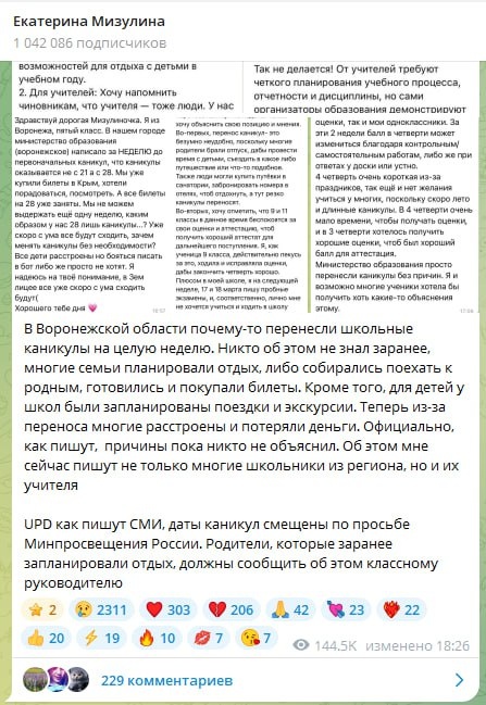 Теперь школьные каникулы пройдут с 28 марта по 5 апреля. Дети выразили недовольство изменениями, нарушившими их планы. Они сообщили о проблеме уполномоченному по правам ребенка Екатерине Мизулиной. В мэрии пояснили, что решение принято согласно рекомендациям Министерства просвещения России. Родители, чьи поездки были заранее оплачены, должны уведомить классного руководителя. Власти подчеркнули важность соблюдения новых сроков для обеспечения качественного образовательного процесса.