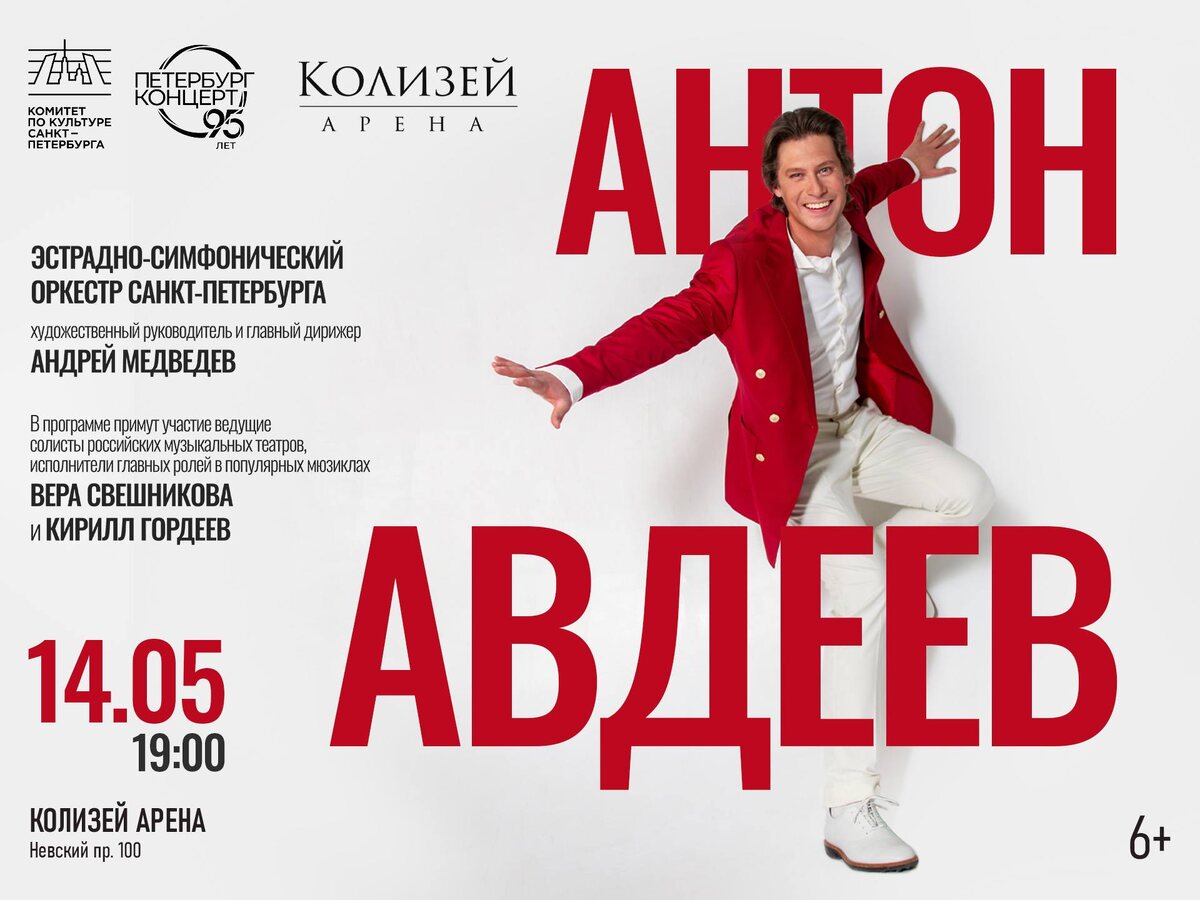) 14 мая «Петербург-концерт» приглашает истинных меломанов в концертный зал «Колизей Арена» на сольный концерт Антона Авдеева, который выступит в сопровождении Эстрадно-симфонического оркестра Санкт-Петербурга под управлением маэстро Андрея Медведева. Блистательный музыкальный тандем — уникальный по красоте и тембру голос тенора альтино и виртуозные инструменталисты — заслуженно считается одной из ярчайших музыкальных достопримечательностей Северной столицы. Идеально сбалансированная программа, в которой чередуются быстрые и медленные композиции, российская и зарубежная музыка, лирика и драйв, несомненно порадует слушателей разных поколений и музыкальных пристрастий. В неё вошли знаковые шлягеры классической эстрады, популярной классики, джаза, рока и, конечно, арии из всемирно известных мюзиклов. Гости вечера — друзья и коллеги, блистательные солисты российских музыкальных театров, исполнители главных ролей в популярных мюзиклах: ведущая актриса российских мюзиклов, лауреат «Золото