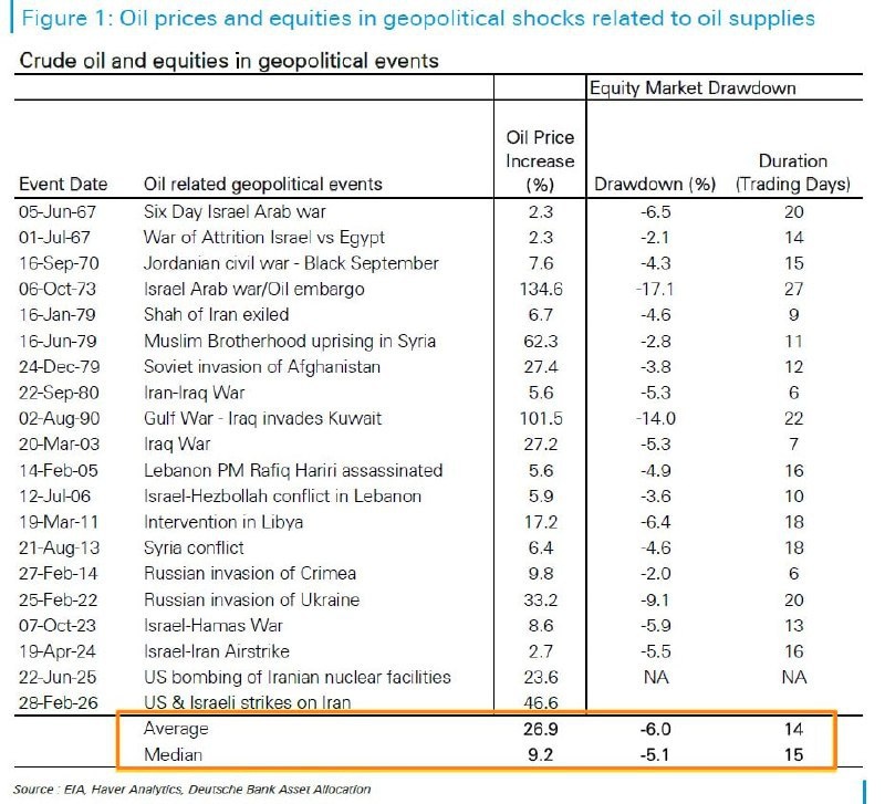 ? Deutsche Bank показывает, что в типичных геополитических кризисах нефть в среднем резво растёт на 27%, а индекс SP500 сдаёт около 6%. Но сейчас нефтяные котлеты взлетели аж на 47%, а акции упали всего на 5% — словно рынок играет в другую игру. Это значит, что нефтяной драйв уже перегрет страхом и может быть, время задуматься, кто сейчас реально выиграет. Акции пока держат удар, но могут и рвануть вниз, если геополитика начнёт играть жёстче. Что с этим делать? Если успел влететь в нефть и сырьё — держи курс и смотри на профит. Но если ты на акциях широкого рынка — хеджируй и будь готов к движению в обе стороны. На горизонте топливо-котлеты и металлургия светятся зелёным, а вот технологии и массовый потребитель могут оказаться в минусе. Так что не расслабляйся — эта рулетка только набирает обороты! #новости #БезПафосаФинансы #нефть #акции #геополитика ##МыслиАлекса