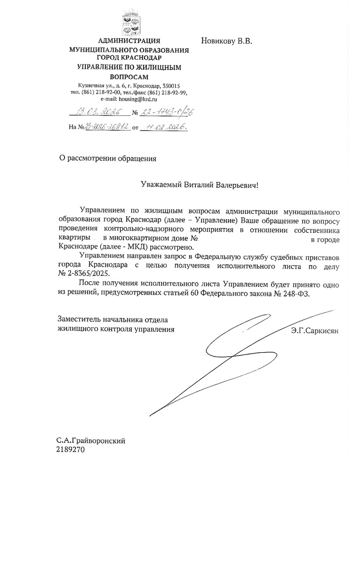 Ранее я уже публиковал материалы о том, что в одном из МКД в мкр Гидростроителей в г. Краснодаре проживает неадекватная собачница, которая содержит в своей квартире свору собак (только по официальным данным - 6 штук). Шум и вонь для соседей - это уже привычно. Но, в ее своре собак, есть и собака бойцовской породы. И этих собак, в нарушение закона, горе-собаковод заводит в подъезд без намордников и без поводков, что создает особый дискомфорт соседям, столкнуться в узком подъезде с этой стаей собак. Тем более, эти собаки уже ранее загрызли местную кошку. В ответ на мое обращение, данная собачниц уже привлекалась к административной ответственности Департаментом ветеринарии Краснодарского края за нарушения при содержании собак. Также, другие соседи подавали коллективную жалобу местному депутату (мои родственники ту коллективную жалобу тоже подписали). Но, пока, эффективно решить проблему не удалось. В ответ на одну из моих жалоб, УЖВ г. Краснодара подало на собачницу иск в суд, и на текущ