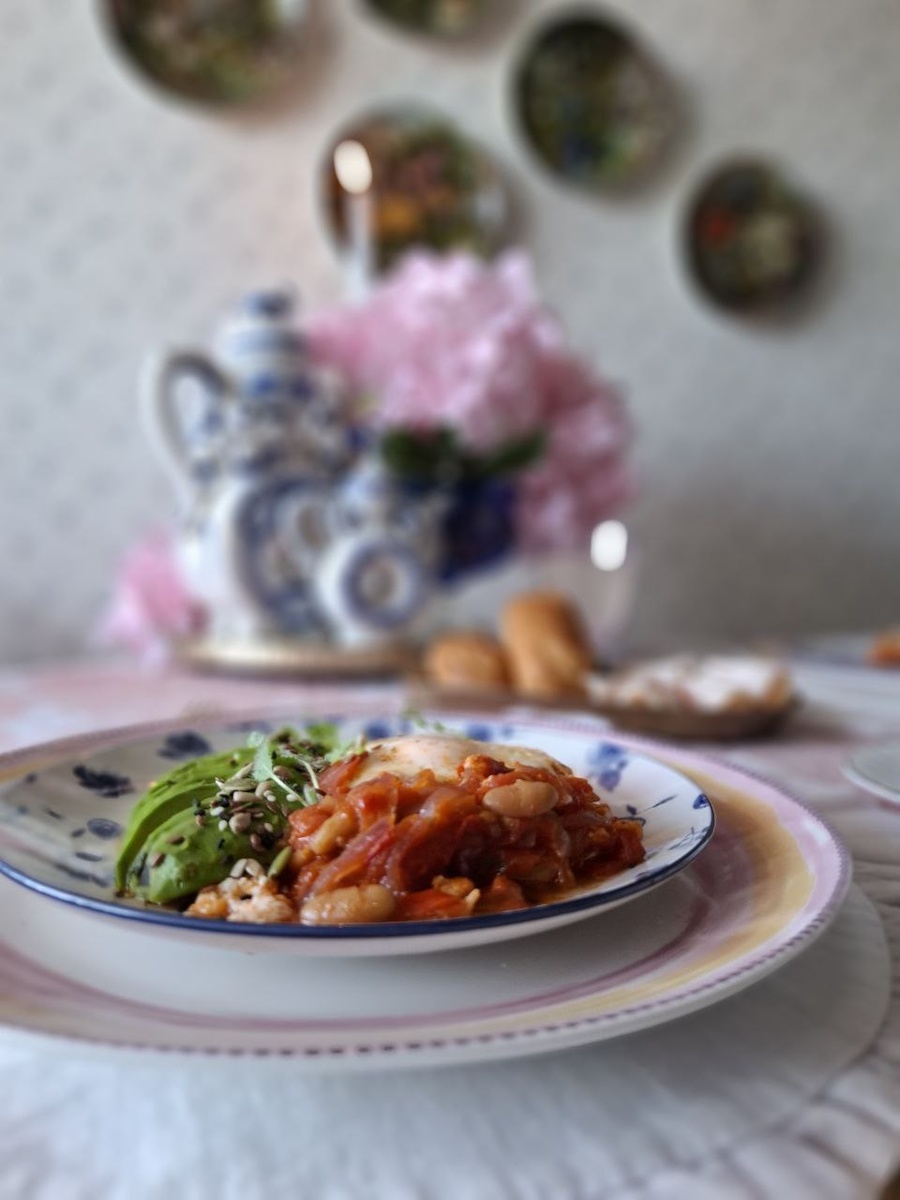 Нет суеты, нет гонки наперегонки с будильником. Ты просыпаешься не от резкого звонка, а от мягкого солнечного луча, что пробился сквозь занавески, или от едва уловимого аромата свежего воздуха за открытым окном. Можно не вскакивать ошалевшей с кровати, не метаться по кухне, ставя кастрюлю с водой для каши и на бегу включая кофеварку. Время теперь на твоей стороне. Можно ещё на минутку укутаться в одеяло, прислушаться к себе и подумать: а чего я хочу сегодня на завтрак? Ты неторопливо сверяешь желания с содержимым холодильника — и находишь там всё, что нужно для маленького кулинарного чуда. Надеваешь халат, делаешь несколько шагов в сторону кухни, завариваешь чашку ароматного кофе… И только потом, насладившись первым глотком, начинаешь творить. Сегодня — шакшука с овощами. Не знаю, готовлю ли я строго по рецепту — скорее, по настроению и тому, что нашлось под рукой. Но вдруг и у вас в холодильнике лежит именно этот набор? Как это было у меня: 1. На сковороде тихонько жарится мелко н
