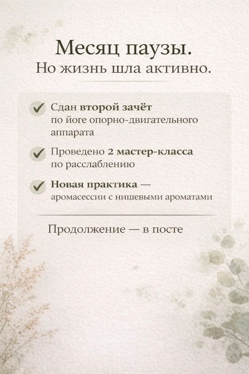 Последний пост был почти месяц назад 😏 И, честно говоря, за это время появлялась мысль… а может просто не писать больше? Не делиться, не вести канал. Кажется, что тишина — проще. Ничего не объяснять, не формулировать, не выкладывать в пространство свои мысли и опыт. Но жизнь за этот месяц шла очень живо: ✅Сдала второй зачёт по йоге опорно-двигательного аппарата — это глубокая и важная для меня тема. Чем больше изучаю тело, тем яснее понимаю: здоровье строится не на усилии, а на точном понимании, как всё устроено. ✅Провела два мастер-класса по расслаблению. И каждый раз вижу одно и то же: когда человек наконец разрешает себе остановиться и выдохнуть, тело начинает меняться быстрее, чем от любой дисциплины. ✅Появилась новая идея практики. С понедельника начинаю проводить аромасессии с нишевыми ароматами. Это не просто «понюхать духи». Это работа с состоянием через аромат: дыхание, внимание к телу, эмоции, воспоминания — всё включается одновременно. Иногда один аромат открывает таки