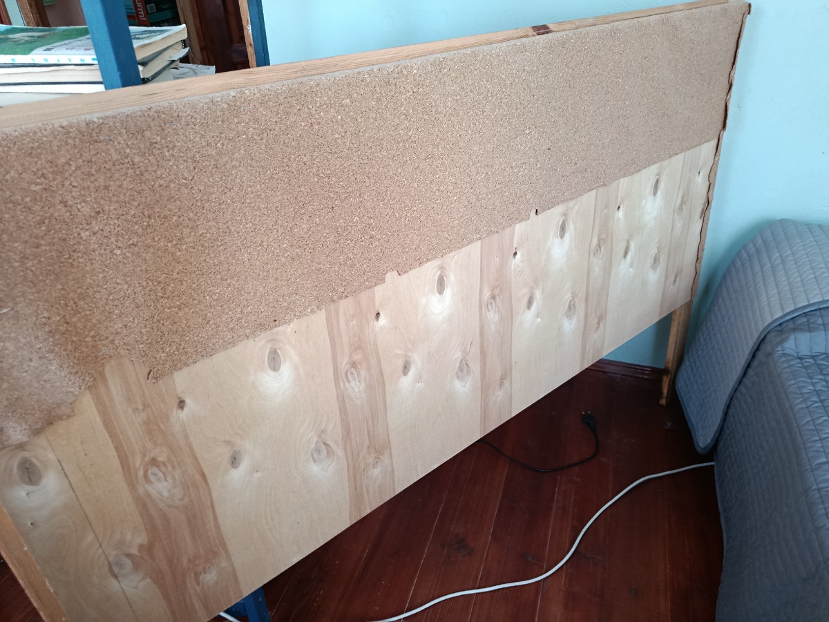 Не секрет, что на дачу люди свозят старые уже не нужные в городской квартире вещи, которые жалко выкинуть - а вдруг пригодятся! Сейчас я категорически возражаю против старого хлама , хотя бывают исключения. Так на дачу было привезено основание для матраса - это почти кровать , но без бортиков и изголовья. В принципе боковые бортики и изножье мне и не нужны - все закрывает большое покрывало. А вот без изголовья спальное место выглядело как то не доделанным. Решила изголовье сделать сама . Понадобился кусок фанеры (можно заменить на OSB или ДСП ) и три отрезка досок ( в моем случае были в наличии обрезки имитации бруса, оставшиеся от обшивки бани). Доски лучше брать потолще, обычная отделочная вагонка тонковата, может со временем искривится. Фанеру обшила куском пробковой подложки под ламинат ( осталась от ремонта в городской квартире и привезена по принципу "пригодится" 🤣 - пригодилась). Пробковое покрытие крепила степлером. Можно было еще дополнительно промазать фанеру клеем, но и