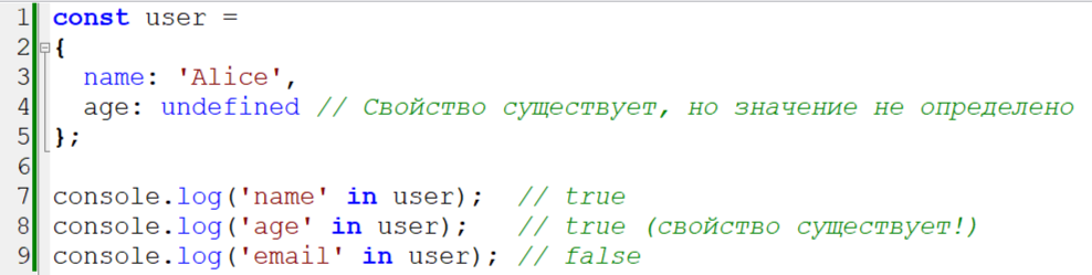 JavaScript — это язык с динамической типизацией, и объекты в нём могут изменять свою структуру во время выполнения программы. Это даёт огромную гибкость, но также требует от разработчика особого внимания при доступе к свойствам объектов. Обращение к несуществующему свойству не вызовет ошибку (в отличие от многих других языков), а вернёт undefined, что может привести к трудноуловимым ошибкам и некорректной работе приложения. Рассмотрим основные методы, которые помогут безопасно работать со свойствами объектов. Оператор in проверяет, есть ли свойство с указанным именем в объекте (включая свойства, унаследованные через цепочку прототипов). Этот метод проверяет, содержит ли объект свойство с указанным именем как собственное (не унаследованное). Самый простой, но потенциально опасный способ. Если свойство существует, но содержит значение undefined, этот метод даст ложный результат. Современный синтаксис (ES2020), который позволяет безопасно обращаться к вложенным свойствам, не проверяя к