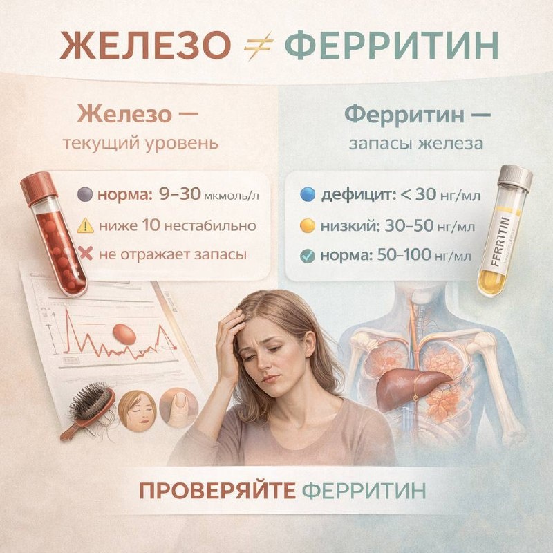 Очень часто на консультациях я вижу одну и ту же ситуацию. Женщина жалуется на сильную усталость, выпадение волос, бледность кожи и снижение энергии. Спрашиваю: проверяли железо? Ответ — «Да, всё в норме». Но когда смотрим ферритин, оказывается, что запасы железа почти пустые. Важно понимать: железо и ферритин — это разные показатели. Железо показывает лишь то количество железа, которое циркулирует в крови в момент сдачи анализа. Этот показатель может меняться в течение дня и не отражает реальные запасы. Ферритин — это белок-хранилище железа. Он показывает, сколько железа организм накопил в запасе. Простая аналогия: железо — это деньги в кошельке, ферритин — деньги на банковском счёте. Поэтому нередко бывает так: железо «в норме», а ферритин очень низкий, и организм уже работает на последних ресурсах. Лаборатории часто указывают норму ферритина от 15. Формально это считается нормой. Но клинически это крайне низкие запасы. В практике ориентируются на такие значения: до 30 — дефиц