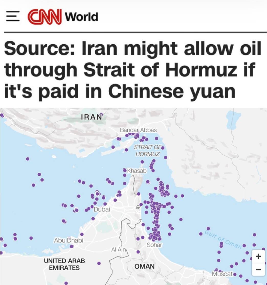 «Иран рассматривает возможность частично открыть Ормузский пролив для прохода нефтяных танкеров, но при одном условии - если сделки по продаже нефти будут проводиться в китайских юанях. По данным источников, власти страны обсуждают новый механизм регулирования движения судов через пролив. Напряжённость вокруг Ормузского пролива вызвала рост цен на нефть до максимального уровня с лета 2022 года В ООН предупреждают, что возможные ограничения судоходства могут серьёзно осложнить поставки продовольствия, лекарств и других гуманитарных грузов по всему миру» @geonrgru | 🇷🇺 MAX | sponsr.ru