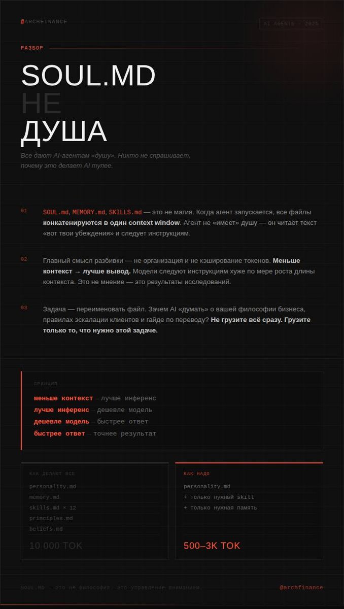 ». Никто не спрашивает, почему это делает AI тупее. SOUL.md — простой текстовый файл, который даёт агенту личность. Создатель OpenClaw популяризировал идею. Агент «читает себя в существование». Звучит глубоко. Вот чего никто не говорит: SOUL.md — это просто системный промпт с хорошим маркетингом. SOUL.md, MEMORY.md, SKILLS.md — когда агент запускается, все файлы склеиваются в один context window. AI не «имеет» душу. Он читает текст «вот твои убеждения» и следует инструкциям. Всё. Это вся магия. Markdown-файлы. Но разбивка по файлам — не бессмыслица. Это гениально. Просто не по той причине, о которой все думают. Большинство считает: файлы нужны для организации. Нет. Для экономии на кэшировании токенов? Ближе. (Anthropic даёт скидку 90% на кэшированные токены — это снижает расходы с $360/мес до $117/мес за того же агента.) Но настоящая причина: меньше контекст = лучше вывод. Прочитайте ещё раз. Когда вы грузите 10 000 токенов личности + убеждений + принципов + навыков + памяти
