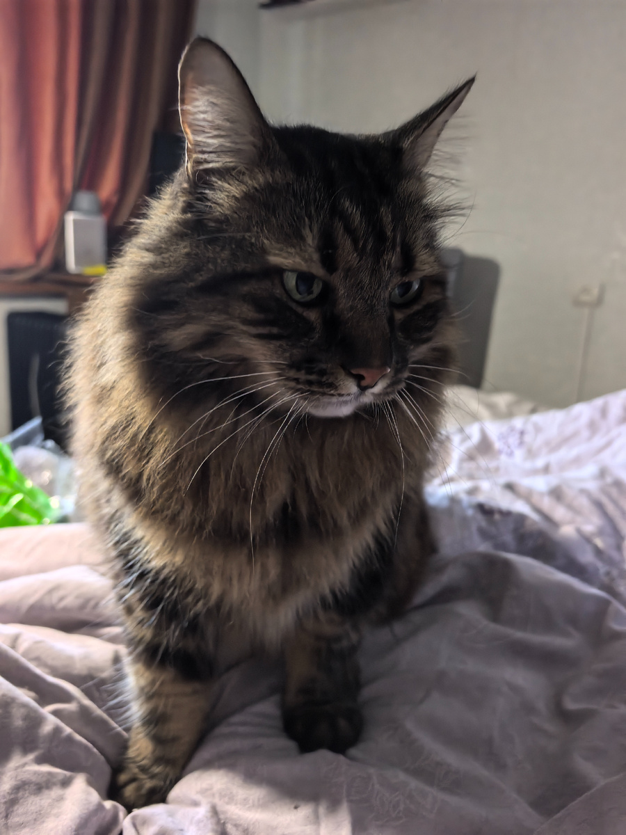Утро началось в 6 часов. Я пришёл к хозяйке и стал мурчать ей. В итоге хозяйка сдалась, встала и дала мне паштет. А ещё открыла дверь на балкон, на ночь они всё закрывают, чтобы я не лазил. Поел и пошёл смотреть кошачий телевизор, а хозяйка пошла дальше спать.