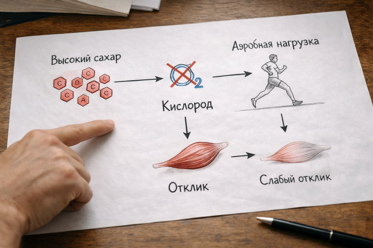 В этой истории обсуждается не расплывчатое «тренировки работают хуже», а более узкая проблема. При высоком сахаре, как сказано в пересказе, мышцы хуже используют кислород во время нагрузки. Из-за этого аэробная выносливость растет не так эффективно.