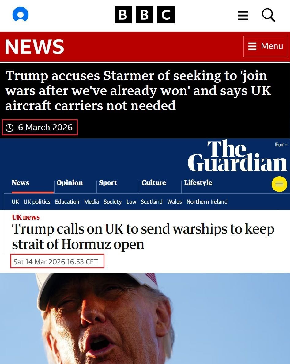 6 марта 2026: Трамп обвинил Стармера в стремлении присоединиться к войне, «которую мы уже выиграли». И сказал, что британские авианосцы ему не нужны. 14 марта 2026: Трамп обратился к Великобритании с призывом прислать боевые корабли для обеспечения судоходства в Ормузском проливе. Подпишись на БородинLIVE Новости