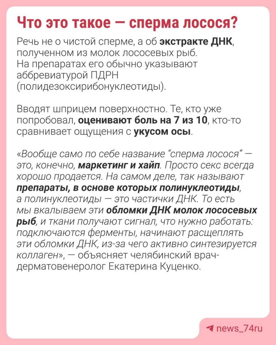Такие уколы часто называют «секретом голливудских звезд». Сейчас услуга доступна едва ли не во всех клиниках Челябинска, ее активно продвигают в соцсетях, некоторые даже готовы делать уколы на дому. Обещают чудодейственный эффект: разглаживание морщин, лифтинг, эффект «стеклянной кожи», блестящей от лоска, будто сразу минус 10 лет. Что это за сперма лосося, где тут хайп, а где правда, сколько это стоит и какие есть риски — читайте в карточках ⬆️