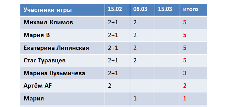 Я публикую в статье не все комментарии, но когда начисляю баллы, внимательно читаю всё, что предлагаете. Потом заношу заработанные баллы в таблицу, а вы проверяете.