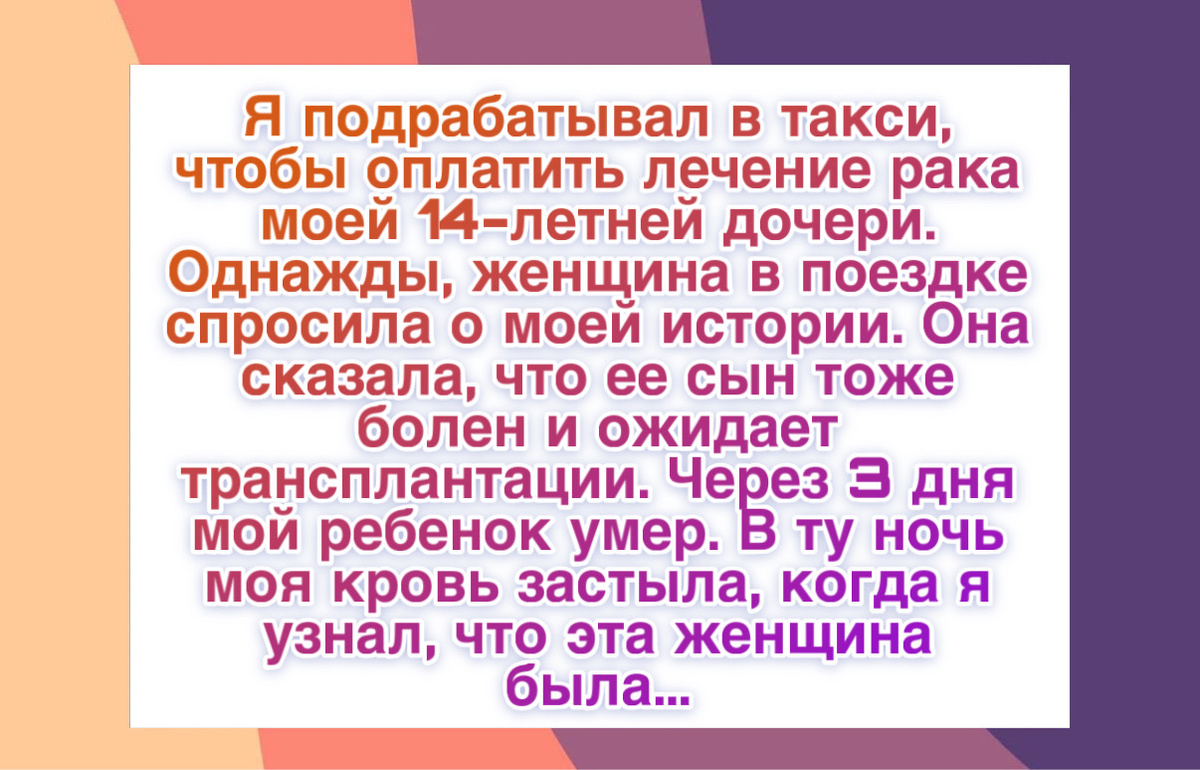 “Я начал работать таксистом по вечерам, чтобы оплатить лечение рака моей четырнадцатилетней дочери. Однажды вечером ко мне в машину села женщина. Мы разговорились, и она спросила о моей жизни. Я рассказал про дочь. Она тихо ответила, что ее сын тоже тяжело болен и ждет пересадки органов. Ему было пятнадцать.
