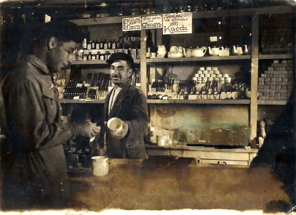 Торговля была развита и в селах армянских. Так в Чалтыре до революции были известны магазины Калугянов, Кароткиянов, Тирацуянов, Атоянов и многих других. На фотографии в магазине, который находился на месте современной аптеки ( хозяин предположительно Лукаш Поповян, об истории этого магазина мы расскажем попозже), на снимке 1940 год, продавец зав хозяйственным магазином Хатламаджиян Хачатур Хазарович, покупатель—Гайламазян Ардашес Семенович.