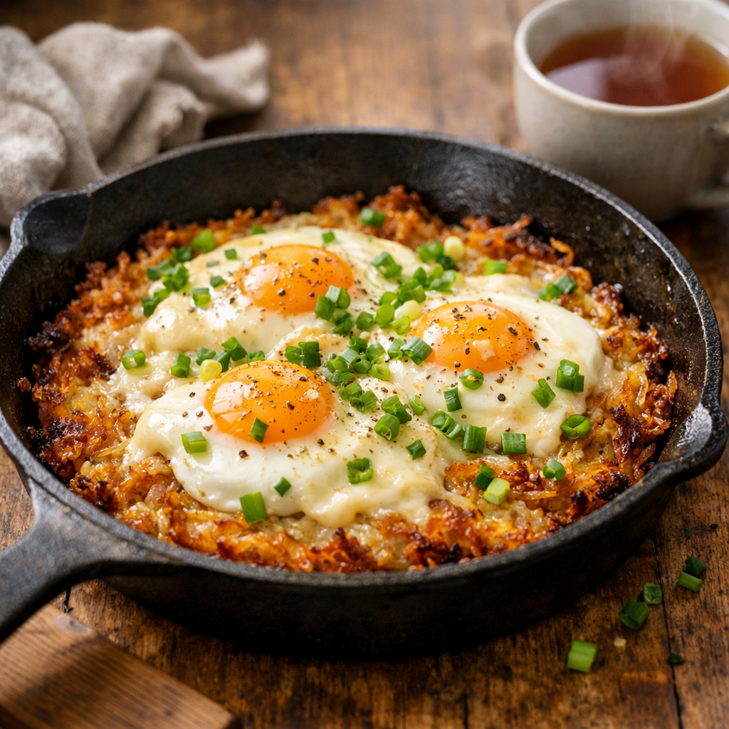 Аккуратно перекладываем наш картофельно-яичный шедевр на большую красивую тарелку. Выглядит это просто потрясающе: снизу плотная, хрустящая, золотистая картофельная корочка, а сверху — нежная, воздушная яичная шапочка с тягучим расплавленным сыром.