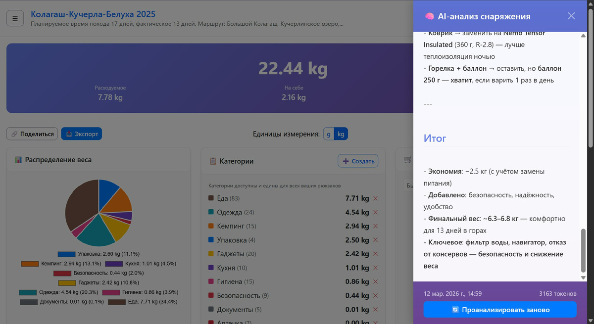 Сделал аналог сервиса LighterPack, который практически перестал работать. # 🎒 Calc Bag — умный калькулятор походного снаряжения. Работает и как сайт, и как встроенное Telegram-приложение, и как бот. Встроенный ИИ-ассистент в боте может проанализировать содержимое вашего рюкзака и дать полезные советы по оптимизации веса или напомнить, если вы что-то забыли. -— ## 📱 Как пользоваться? 1. Зайди в бота calc_bag_bot и в меню нажми "Открыть приложение". 2. Добавляй, редактируй своё снаряжение. Ты можешь создать несколько "рюкзаков" для разных походов и выбрать в него вещи из своего списка снаряжения. Карточки в списках можно перетаскивать drag-n-drop. 3. Суммарный вес снаряжения отображается на главном виджете вверху. 4. Своими списками снаряги можно также делиться, если опубликовать содержимое рюкзака. Сервис даст короткую ссылку, которую можно использовать в своих соцсетях и отправлять друзьям. 5. В правом нижнем углу экрана нажми на пульсирующий значок мозга — умный ассистент даст тебе