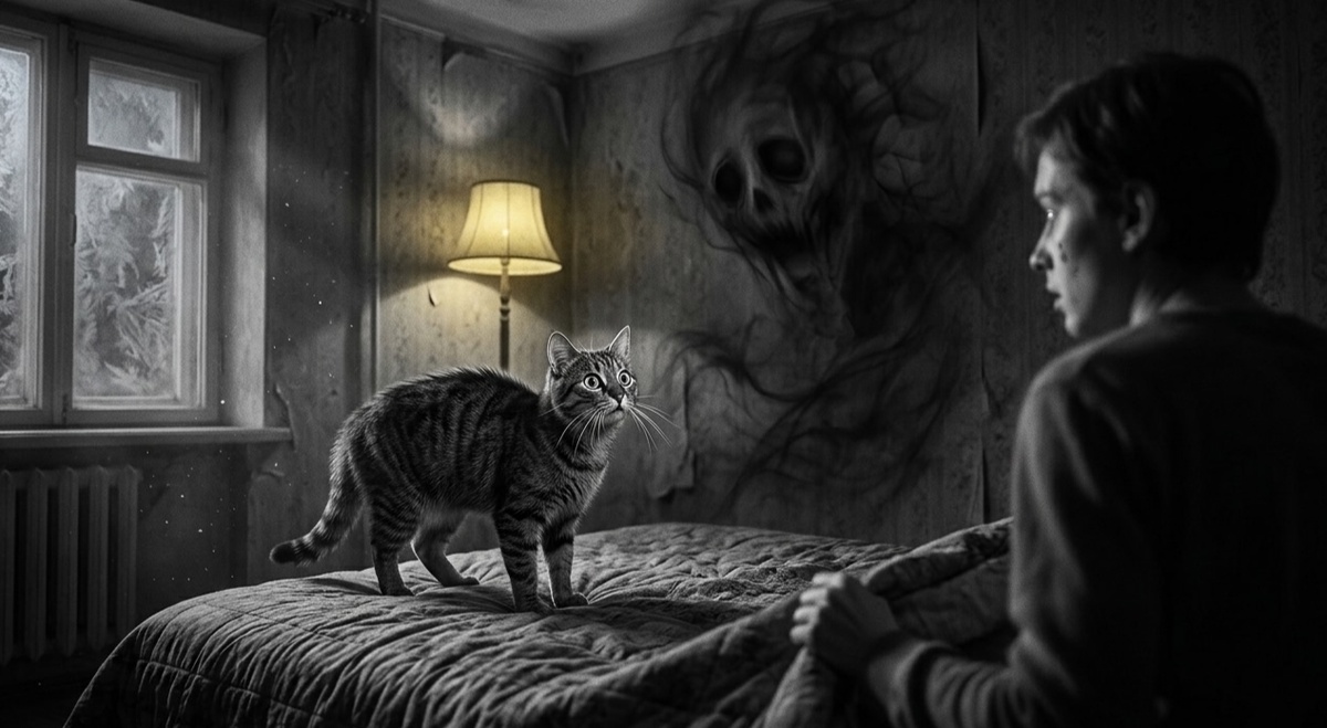 Я почувствовал, как воздух вокруг внезапно стал плотным, словно я погрузился в ледяную стоячую воду. В ушах возник тонкий, едва уловимый звон, а на коже лица проступило ощущение, будто по ней проводят невидимой нитью паутины. Кошка медленно, почти торжественно подняла лапу и начала трогать пустоту прямо передо мной. Ее когти выпускались и втягивались, она словно пыталась поймать «невидимый бантик», который кто-то заботливо раскачивал перед ее носом. Она начала громко, утробно мурлыкать, вовлеченная в эту игру, а я лежал, боясь моргнуть, кожей чувствуя: кто-то незримый сейчас наклонился надо мной, почти касаясь моего лица своим холодным отсутствием.