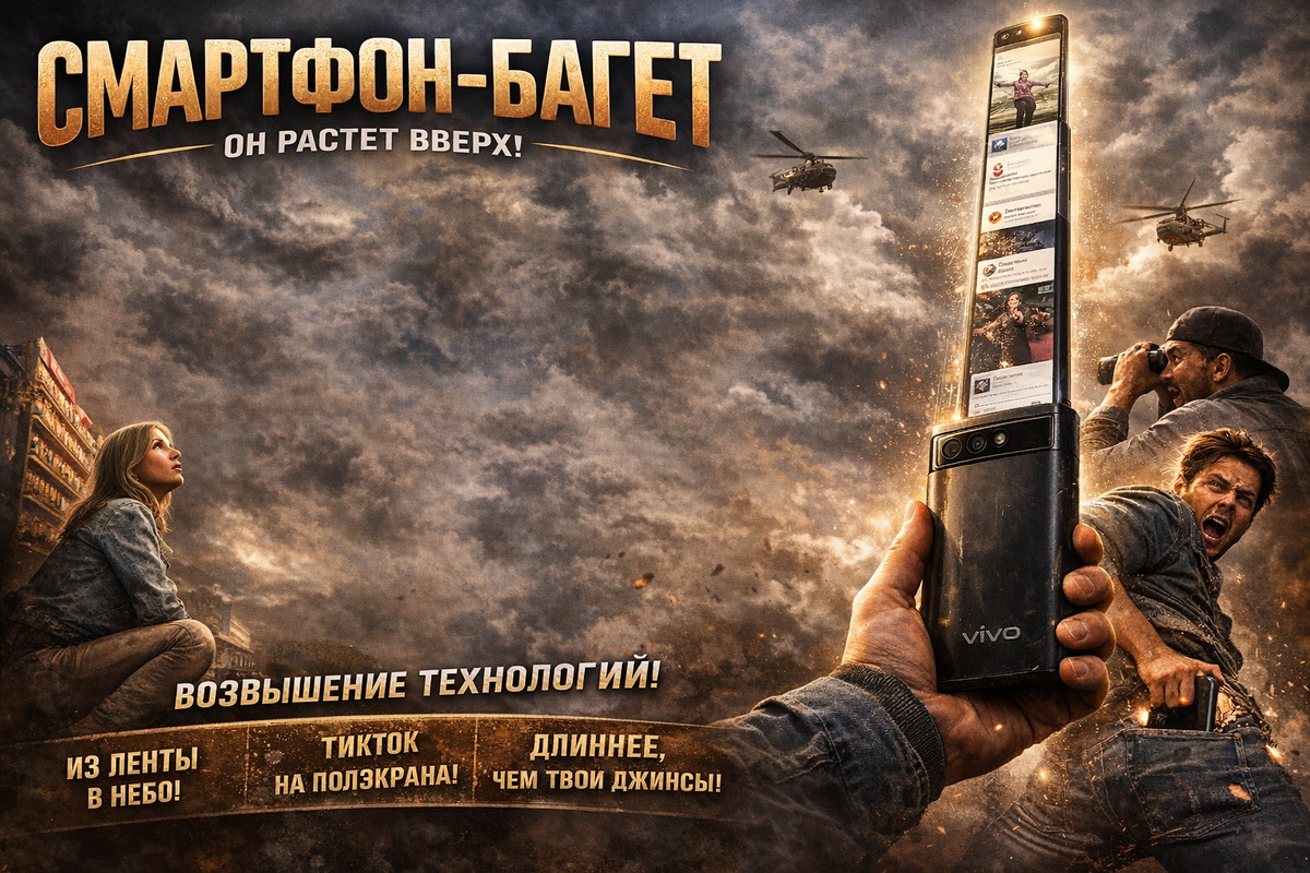 Пока одни производители пытаются превратить телефон в квадратный планшет, инженеры Vivo, кажется, вдохновились кулинарией или сказкой про Джека и бобовое зернышко. Встречайте новый патент: смартфон с вертикально растягивающимся экраном! Если раньше «лопаты» росли вширь, и ими стало удобно разве что отбиваться от медведей, то Vivo решила пойти другим путем — в стратосферу. Согласно свежим схемам, экран устройства скрыт внутри корпуса и при необходимости выезжает вверх. Ширина остается прежней, а вот высота... скажем так, ваш список контактов теперь можно прокручивать, просто переводя взгляд от колен до потолка. Техническое устройство: Внутри корпуса спрятан механизм с мотором и гибкая панель, которая огибает внутренний вал (скорее всего, в нижней части устройства). Толщина корпуса из-за этого чуть больше стандартной, что логично — рулон нужно где-то хранить. Камеры: На патентных чертежах видна горизонтальная полоса с тремя камерами на задней панели (в стиле Google Pixel), которая остает