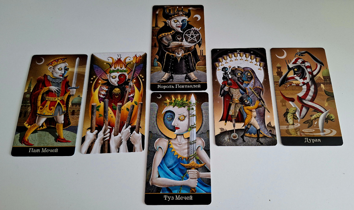 Передо мной лежит удивительный, очень динамичный и психологически сложный расклад: Паж мечей, Шестёрка жезлов, Король пентаклей, Туз мечей, Десятка кубков и Дурак. Я смотрю на эту картину целиком, и первое, что бросается в глаза - это мощнейший контраст между его попытками всё контролировать головой и рвущимися наружу истинными желаниями сердца.