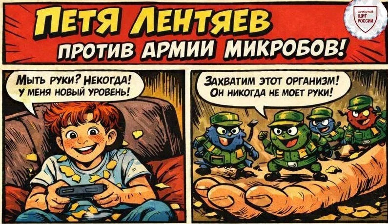 Роспотребнадзор запустил новую образовательную серию комиксов «Приключения Пети Лентяева» для детей. Первый выпуск под названием «Личная гигиена» уже доступен для скачивания — в нем веселый школьник Петя сражается с армией микробов и учит юных читателей побеждать невидимых врагов. Проект реализуется в рамках программы «Санпросвет». Комиксы разработаны специалистами Роспотребнадзора с учетом возрастных особенностей детей и содержат важную информацию о здоровье в увлекательном формате . В первом выпуске «Личная гигиена» главный герой Петя Лентяев вступает в борьбу с армией коварных микробов и раскрывает секретные приемы защиты от них. На 2026 год запланирована целая серия приключений Пети : Летом Петя расскажет о правильном хранении продуктов и защите от пищевых отравлений. Осенью юных читателей ждут приключения в мире прививок и защиты от инфекций. К зиме Петя станет настоящим экспертом по созданию безопасного дома. История персонажа началась в 2023 году с Всероссийского конкурса детски