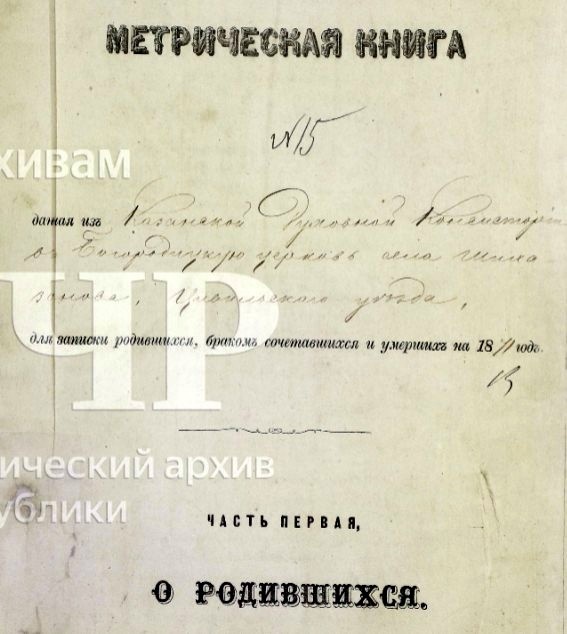 Село Шихазаны. Метрическая книга о родившихся за 1863-1871 гг. ГИА Чувашской Республики (ГИА ЧР), фонд № 557, опись № 7, дело № 309, стр. 640 скан. Метрическая книга, данная из Казанской Духовной Консистории в Богородицкую церковь села Шихазанова Цивильского уезда для записки родившихся, браком сочетавшихся и умерших на 1871 год. Часть первая. О родившихся. Стр. 676 скан. Июнь. № 113. 13 числа родилась. 17 числа крещена. Ольга. Родители: Деревни Ожанаровой казенный крестьянин Яков Климентов Абалымов и законная жена его Феодосия Иванова, оба православного исповедания. Восприемники: Села Шихазанова казенный крестьянин Семен Кодратов Дунаев и города Чебоксар умершего мещанина Петра Афанасьева Щепелева жена Александра Климентова Щепелева. Таинство крещения совершил священник Виктор Богатырев. Дьячек Никита Тайбинский. https://yandex.ru/archive/catalog/4cc118ea-9ab8-430d-8582-1b46d299118b/676