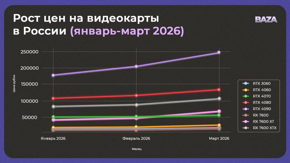 ‼️ ВИДЕОКАРТЫ РЕЗКО ПОДОРОЖАЛИ в России — с конца февраля цены на популярные модели выросли примерно на 30