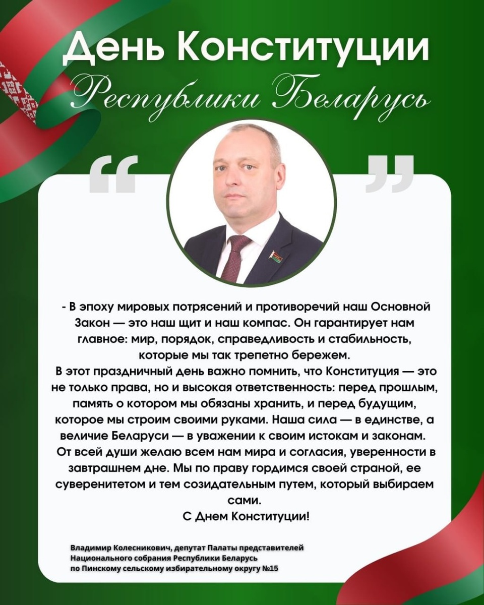 округу №15: - В эпоху мировых потрясений и противоречий наш Основной Закон — это наш щит и наш компас. Он гарантирует нам главное: мир, порядок, справедливость и стабильность, которые мы так трепетно бережем. В этот праздничный день важно помнить, что Конституция — это не только права, но и высокая ответственность: перед прошлым, память о котором мы обязаны хранить, и перед будущим, которое мы строим своими руками. Наша сила — в единстве, а величие Беларуси — в уважении к своим истокам и законам. От всей души желаю всем нам мира и согласия, уверенности в завтрашнем дне. Мы по праву гордимся своей страной, ее суверенитетом и тем созидательным путем, который выбираем сами. С Днем Конституции! @Пинский Вестник 📱Ютуб 📱ВК 📱ИНСТАГРАМ 📱ОК 📱ФЕЙСБУК 📱ТИК ТОК Прислать новость