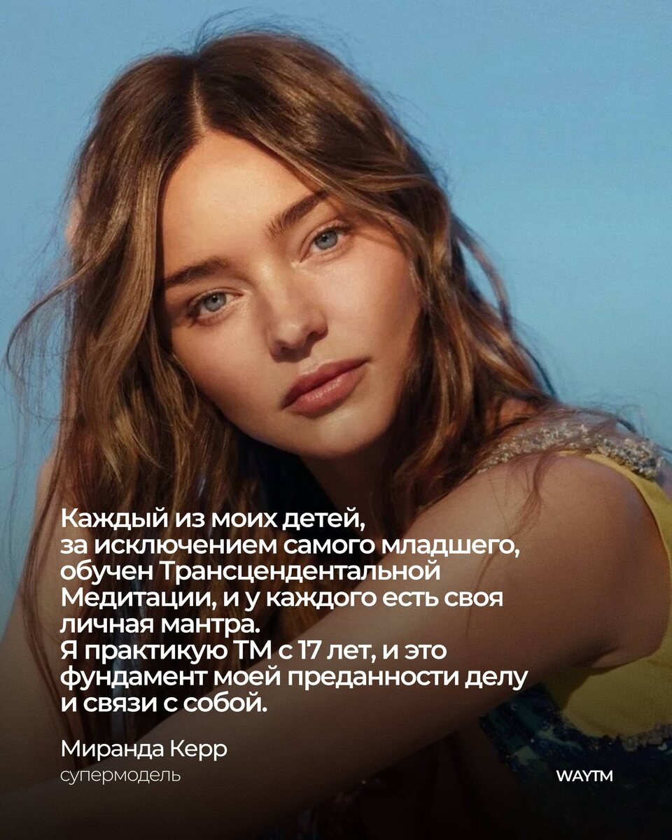 Австралийская супермодель Миранда Керр делится простыми, но важными секретами прекрасного самочувствия и привлекательности, среди которых регулярные практики Трансцендентальной Медитацией. Она практикует ТМ с 17 лет и считает эту технику основой связи с собой и внутренней гармонии. Более того, модель обучила медитации и своих детей – у каждого из них есть собственная мантра. Старший сын регулярно практикует вместе с ней в 6 утра по собственному желанию, что позволяет ему чувствовать себя гораздо спокойнее в течение всего дня. По словам самой Миранды, медитация помогает сохранять ясность в течение дня, а также поддерживать здоровье. Именно внутреннее состояние = уравновешенная нервная система – она называет фундаментом внешней красоты и источником энергии. Источник. #waytmзнаменитости