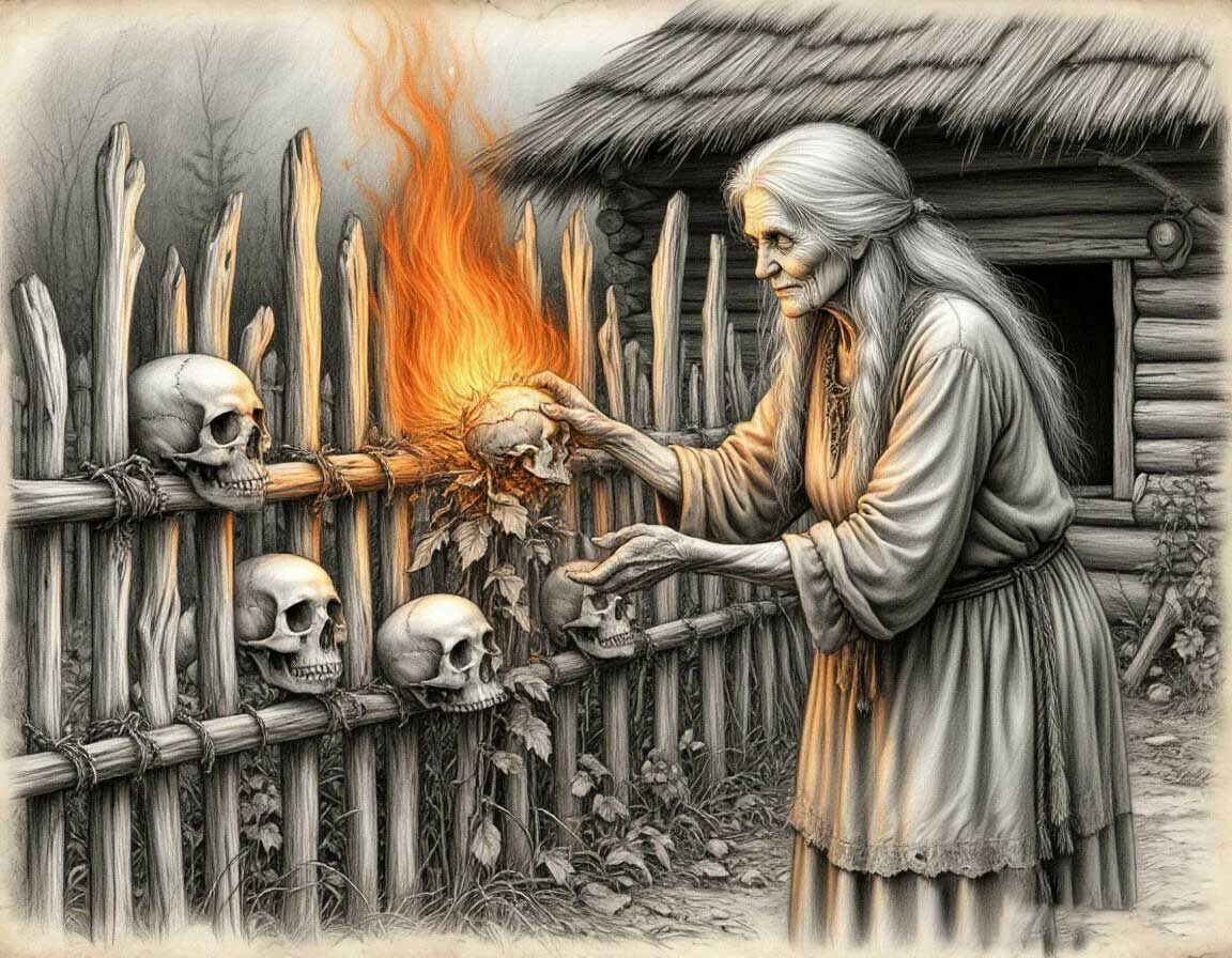 Когда Василиса подходит к избушке Бабы-яги, первое, что она видит — забор из человеческих костей. На кольях — черепа. Вместо ворот — ноги. Вместо запоров — руки.