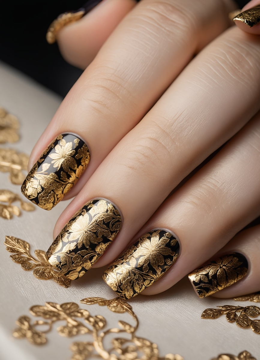 Стемпинг и фольга прекрасно дополняют друг друга, создавая уникальные дизайны на ногтях. Например, можно использовать стемпинг для нанесения геометрических узоров или цветочных мотивов, а затем добавить кусочки фольги, чтобы выделить ключевые элементы. Это придаст маникюру объем и яркость, а контраст между матовой основой и блестящей фольгой создаст эффектный визуальный акцент.