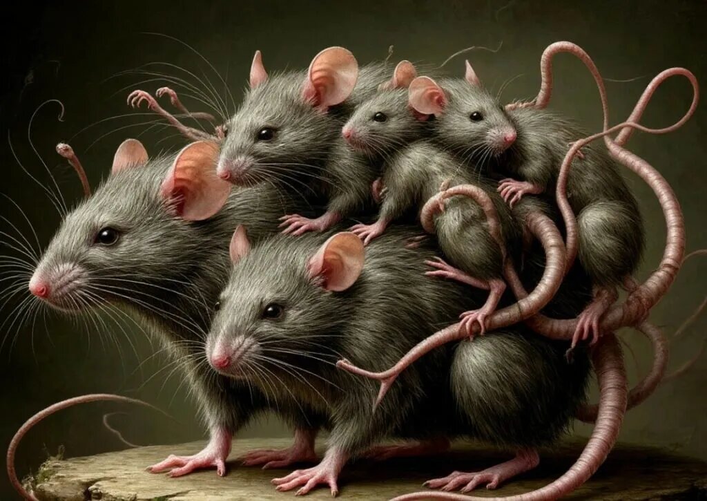 Это были крысы. Много крыс. Их хвосты переплелись в тугой узел, будто кто‑то нарочно связал их вместе. Они не могли двигаться, только дёргались, издавая странные, почти человеческие стоны. Их глаза — красные, воспалённые — уставились на Мартина.