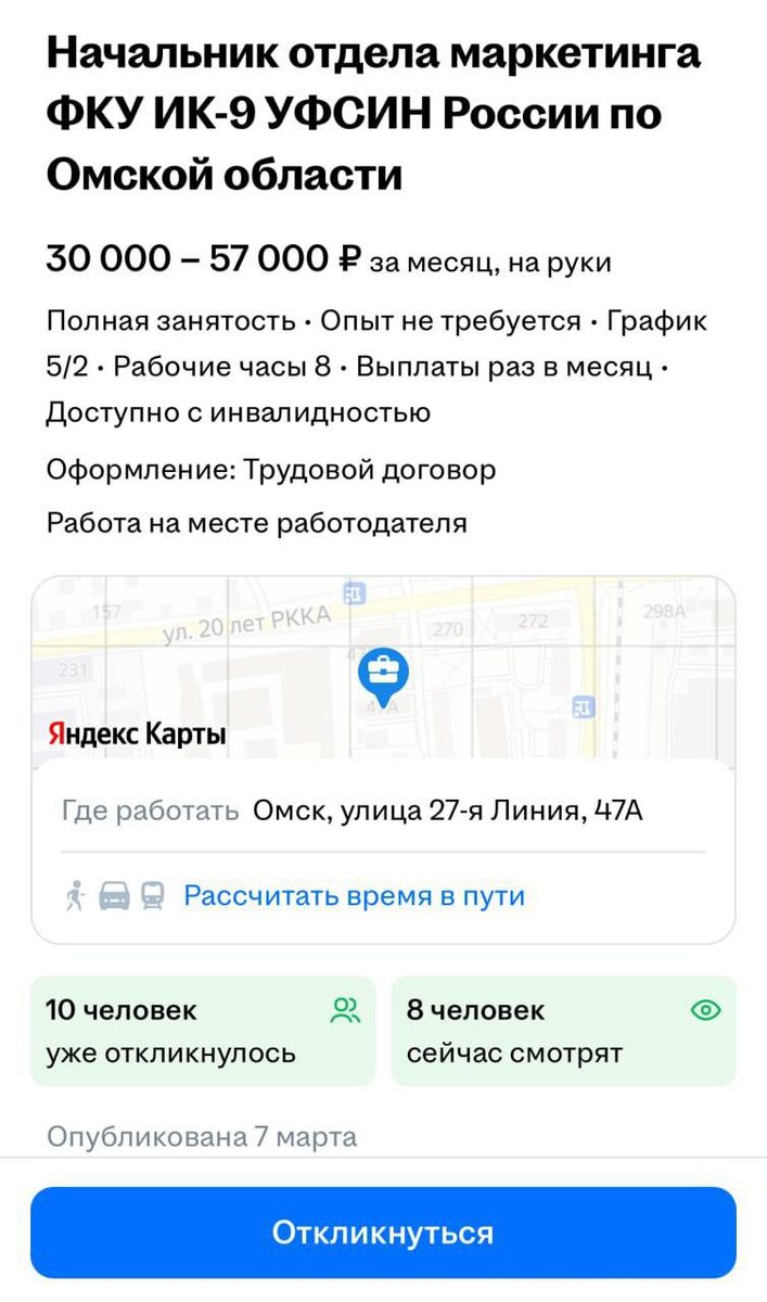 Омская колония строгого режима ищет начальника отдела маркетинга. Зарплата от 30 000 до 57 000₽.