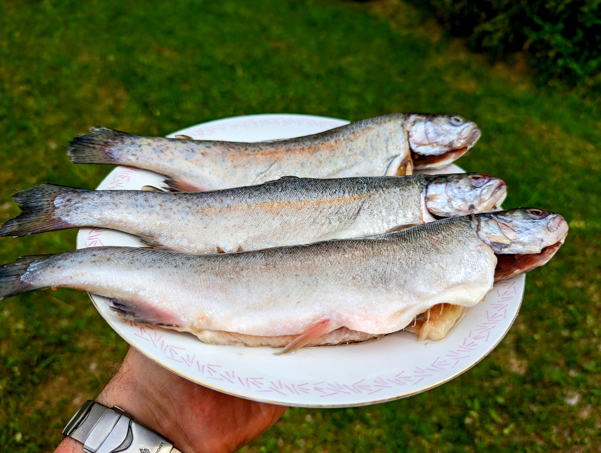 Для мужчин - прежде всего. Ответ на все вопросы, философский камень предпраздничных хлопот. Как универсальный ключ, форель подходит к большинству случаев, когда нужно сделать любимой приятное. Причём как в большом размере, так и маленьком. Её даже чистить самому не надо – в приличных магазинах за нас всё сделают, потрошёная-чищенная, только взглянуть бегло, не осталось ли где чешуи-жабер. Времени немного, прелюдии излишни, приступим. Маленькая, в 300 грамм. Конечно, порционная, по штучке. Умыть прохладным, обсушить бумажным полотенцем, соль-перец снаружи и внутри. Сковорода, разогреть рафинированное оливковое, добавить кусочек топлёного сливочного – жарим. До ультимативно хрустящей корочки, такой чтобы взглянул на позолоту и красота – сватайся и женись. В подогретую тарелку, скибочку лимона сбоку, зелёный салат и помидорка – две черри впополам. Большая. С ней хлопот больше, но появляется манёвр по порциям. Та же соль с перцем, пусть полежит-отдохнёт, пока начинка делается. Лук-шалот в