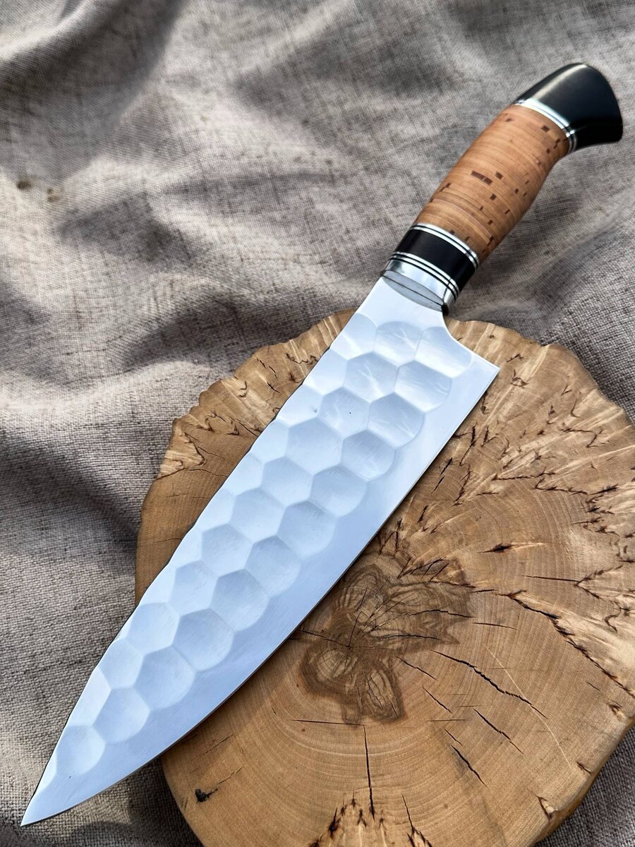 ! Преимущество: Клинок из отечественной нержавеющей стали 95Х18 в полном камне — это не только надёжность и долговечность, но и легкость в уходе. *Матовое каменное покрытие предотвращает налипание продуктов*, облегчая работу даже с самыми сочными ингредиентами. Рукоять из натуральной бересты — всегда тёплая, не скользит даже во влажной ладони и не впитывает запахи. Заточка — в бритву: нож сразу готов к тонкой нарезке и филировке. Твердость клинка — 58 HRC: оптимально для кухонных ножей — острый, прочный, устойчивый к износу. В комплекте — ножны из натуральной кожи. *Возможно изготовление формованных ножен* (+8000 ₽). Цена: 11 440 ₽ 📩 Для заказа пишите: Telegram: [@Nazarklinokbot](https://t.me/Nazarklinokbot) WhatsApp/Viber: [ +79101343831](https://wa.me/79101343831) Наш канал MAX -> подписаться #кузницаназарова #шефнож #кухонныйнож #ножручнойработы #95х18 #береста #ручнаяработа #кухонныеножи #подароккулинару #nazarklinok