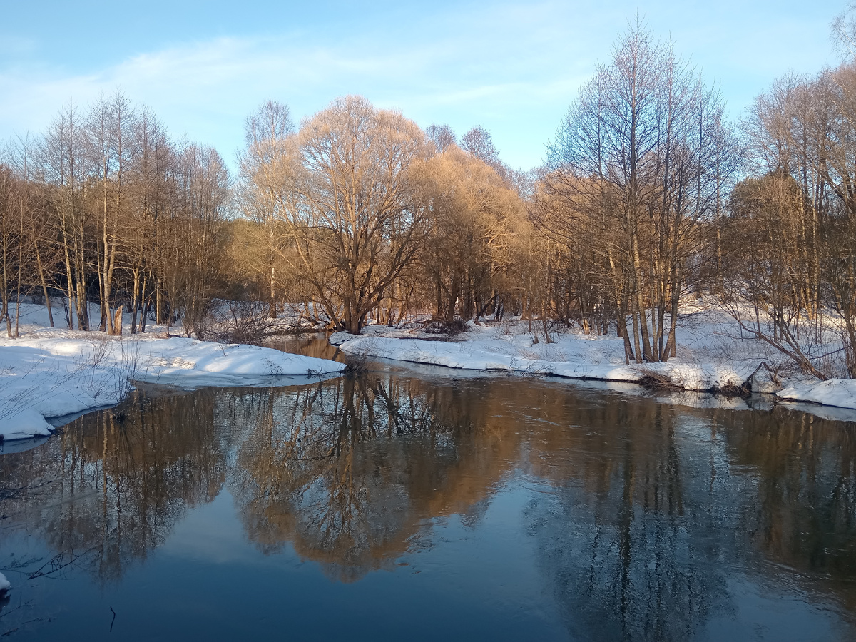 Всем привет ) Мы тут на радостях от весны с Ярославом решили пройти прогуляться по нашего стандартному маршруту. Это пешая прогулка примерно на 12 км по полям и деревням с конечной точкой в Обнинске на автостанции, где садимся на пазик обратно до дома 🙂 Поэтому предлагаю прогуляться с нами, и жаль, что не могу передать через статью чистый воздух 😞 Первая остановка в нашем маршруте - мостик через речку Дырочная. О, запомните ее такой! Полноводная, шикарная, ведь летом она становится ручейком, через которую можно проехать на машине. Вообще мы хотели бы дойти до реки Протва, посмотреть и ужаснуться или обрадоваться. Примерно года 2 назад река на столько поднялась, что затопило очень много деревень и снт. Надеюсь в этом году природа таких шуток не преподнесет... Но поднявшись на горочку, тропа явно стала меньше. Что не удивительно) Ведь дальше это дорога ведет на кладбище и летом ее используют для объезда города. Первый по колено провалился Ярослав 😁Выбрался, а следом провалилась я и