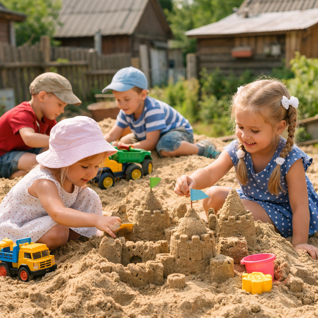 Вот дядя Федя и придумал— привёз телегу песка, жёлтый, сверху сухой, сыпучий, а копнёшь поглубже, он мягкий, хоть куличи лепи, хоть города строй.