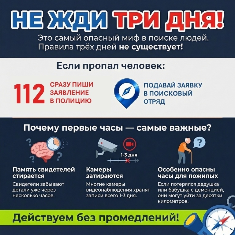 ! Это самый опасный миф в поиске людей. Никакого «правила трёх дней» не существует! Если пропал человек — не теряйте ни минуты: 👮♂ Звоните в полицию СРАЗУ по номеру 102 или 112. Или обратитесь в ближайший отдел полиции, чтобы написать заявление. Ждать три дня не нужно — заявление обязаны принять немедленно. 🆘 Сообщите волонтёрам в поисковый отряд. Телефон поисково-спасательного отряда #ПрикамьеПОИСК: 8 922 345 67 02 Почему важны первые часы? 👁 Память свидетелей стирается. Вы помните, во что был одет человек, которого вы встретили сегодня утром? А позавчера? Свидетели забывают детали уже через несколько часов. Через три дня шанс найти очевидцев, которые дадут точную информацию, стремится к нулю. 📹 Камеры перезаписываются. Многие системы видеонаблюдения хранят записи всего 1–3 дня, а затем записывают поверх новые данные. 👵 Особенно опасны часы для пожилых. Если потерялся дедушка или бабушка с деменцией, они могут уйти за десятки километров за несколько часов. Время работае