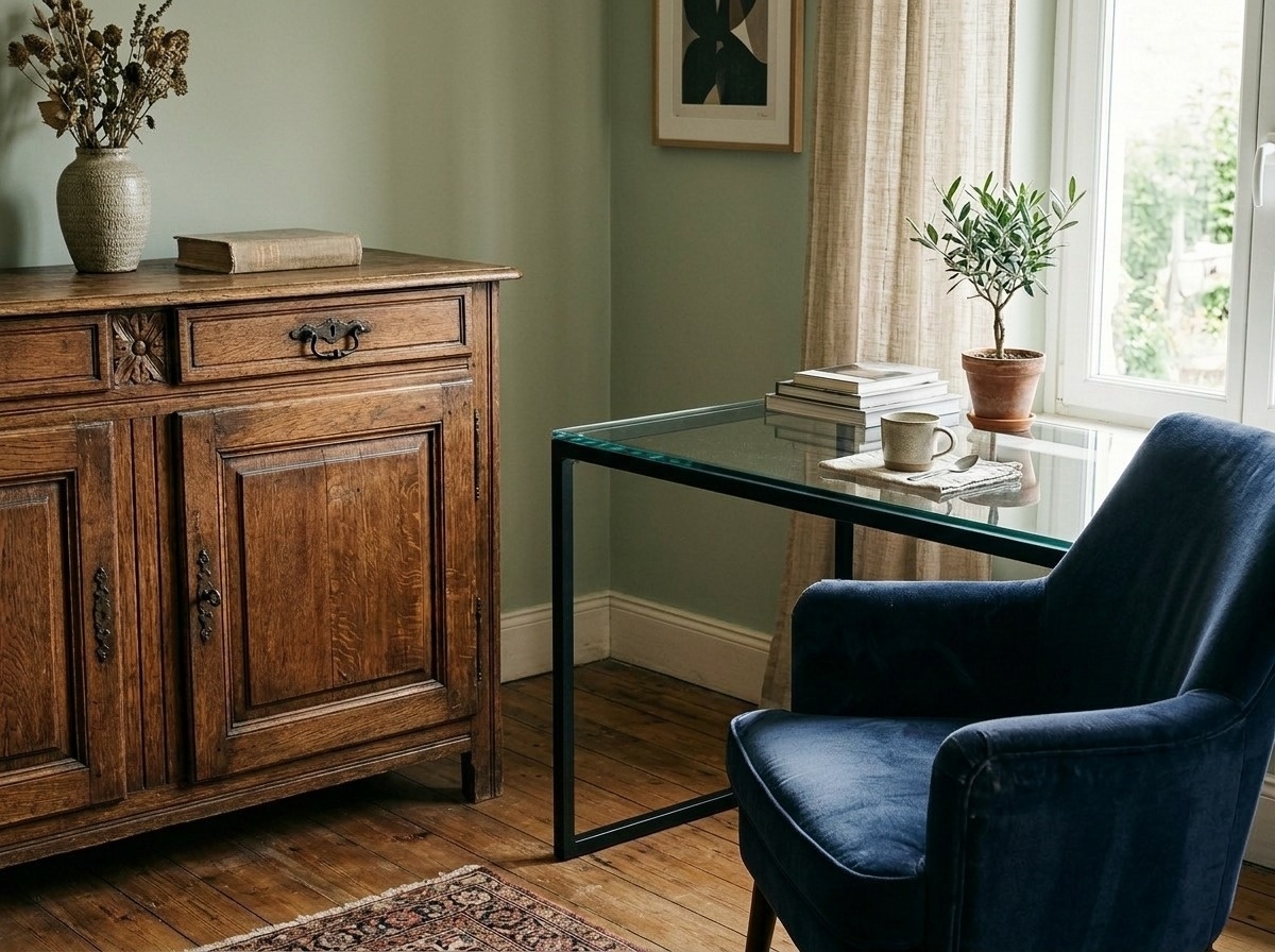 Дерзайте смешивать разные фактуры: старое дерево отлично дружит с гладким металлом или стеклом. Грубая текстура антиквариата подчеркивает технологичность новинок. Это создает ту самую многослойность, которую хочется разглядывать.