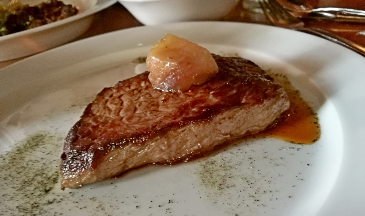 Кусок мяса. Да даже просто говядины. Бычок тот, может, и травки зелёной не видел – одним зерном кормили – вполне подойдёт. Просто чтоб была такая жиринка сеточкой, чтоб жарить сподручнее.