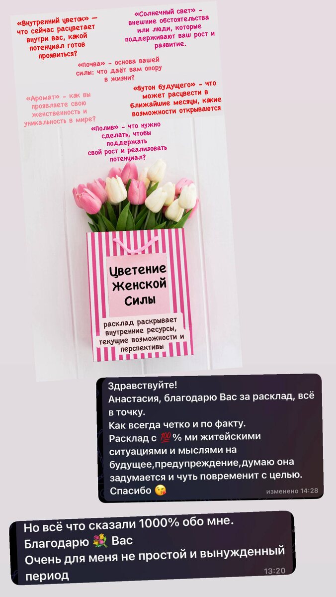 ЦВЕТЕНИЕ ЖЕНСКОЙ СИЛЫ по супер цене 🍑🍑🍑🍑 Расклад состоит из 6 вопросов, — 6 аудио пояснений. 🎴Колоды для работы: Taro infinity Spring glade tarot Из данных нужно только ваше имя или если расклад в подарок, имя этого человека Для заказа пишите под постом/Max/whats’app Я в МАХ