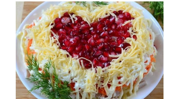 - Украсить салат гранатом, выложив зёрна сердечком, и тёртым сыром.