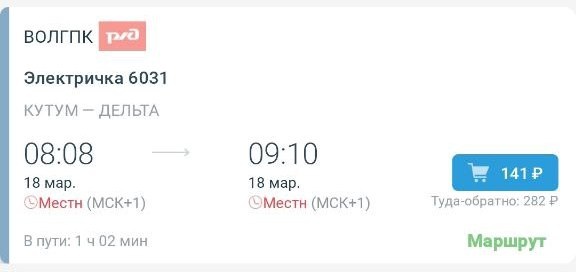 С 15 марта в Астраханской области возобновляется движение пригородного электропоезда по сезонному «дачному» маршруту «Кутум – Дельта». Электричка будет работать по расписанию в дни повышенного спроса – по средам, субботам и воскресеньям. Маршрут «Кутум – Дельта»: Обратный маршрут «Дельта – Кутум»: Стоимость проезда в одну сторону, по данным приложения «РЖД Пассажирам» составляет 141 рубль. Пригородный поезд № 6031/6032 традиционно запускают в период начала дачного сезона, чтобы жителям было удобнее добираться до садовых участков и обратно в город. Сообщение В Астраханской области снова начнет ходить «дачная» электричка появились сначала на Астрахань.Ру последние новости региона.
