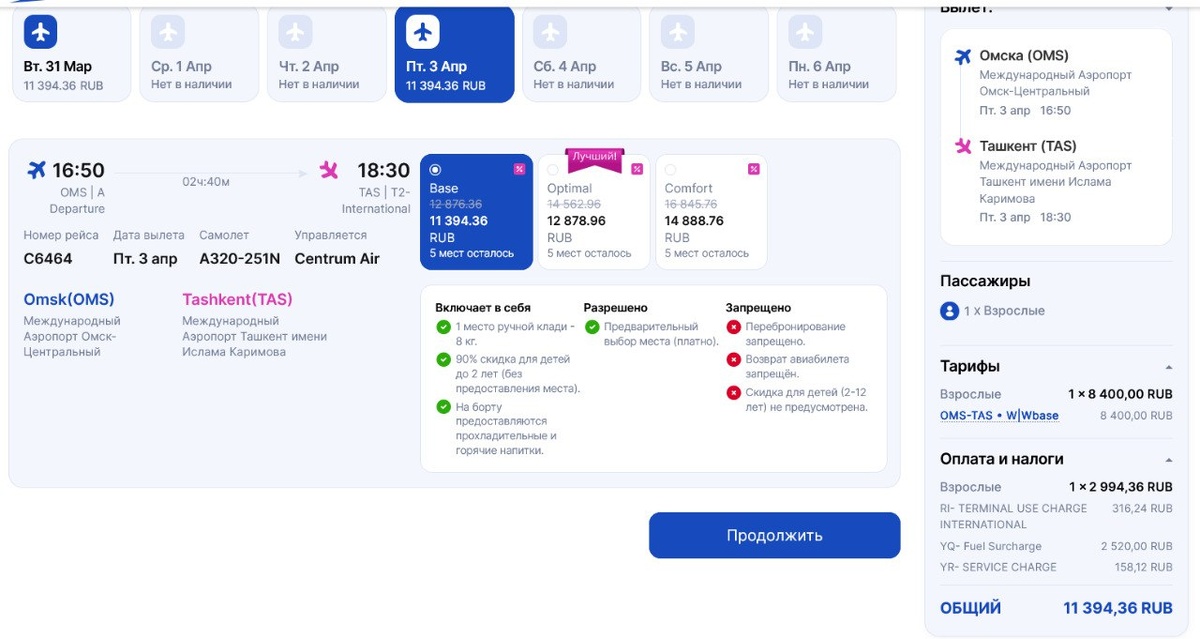 рублей в одну сторону. В этот тариф включена ручная кладь (до 8 кг), прохладительные и горячие напитки. Билет туда-обратно обойдется в сумму от 24 тыс. рублей. Напомним, что прямые рейсы в Омск из столицы Узбекистана появятся с 31 марта. Вылеты запланированы дважды в неделю - по вторникам и пятницам. Выполнять их будет узбекистанская авиакомпания Centrum Air. Время в пути составит 2 часа 40 минут. Новости Омска в Max. Подписаться