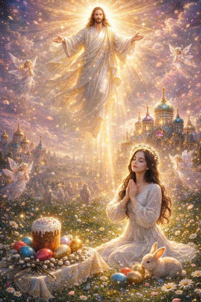 Работа участника нашего конкурса. Иисус Христос в сияющих белых одеждах, переливающихся золотом и перламутром, парит в небе над древним городом. Он смотрит вниз на всех людей с любовью и милосердием, Его руки раскрыты в благословляющем жесте, от Него исходят мощные лучи золотого света, озаряющие всё вокруг. Внизу, на цветущем весеннем лугу, стоит очень красивая молодая девушка в винтажном белом платье. Она опустилась на колени и молится, сложив руки у груди, её глаза закрыты, лицо озарено внутренним светом. Рядом с ней на земле лежит пышный букет из серебристых веток вербы, и каждая ветка светится и искрится, отвечая на свет с небес. Перед девушкой на расшитой золотом белой скатерти стоит высокая румяная пасха, посыпанная разноцветной сахарной посыпкой, вокруг неё лежат яркие крашеные яйца — красные, синие, золотые, все они тоже мягко светятся изнутри. Вокруг девушки в воздухе парят прозрачные ангелы с крыльями из лепестков цветов, они тоже молятся вместе с ней. У её ног сидит пушисты