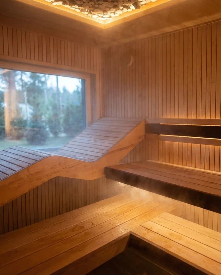 Он дополнительно отдаёт тепло в помещение и помогает печи работать эффективнее, поэтому парная прогревается равномерно и держит стабильную температуру. На стенах использована ольха в формате рейки. На пологах местами применена термодревесина — это практичный материал, который хорошо подходит для условий высокой температуры и влажности. Отдельное внимание здесь уделили окну. Оно панорамное, с видом на ландшафт участка, и при этом с подогревом, чтобы стекло не запотевало из-за разницы температур. За счёт этого сохраняется и вид, и ощущение открытого пространства даже во время парения. У окна сделан удобный эргономичный полог, который повторяет изгибы тела. На нём комфортно расположиться и сидя, и лёжа. В итоге парная получилась продуманной: здесь всё работает на удобство, тепло и нормальный отдых.